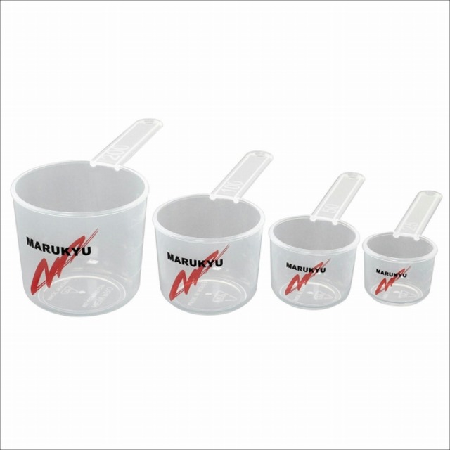 [◆沖縄/離島/北海道のお客様に対する発送が出来ません。]【メーカー希望小売価格\500】【マルキュー 取っ手付き計量カップ 商品の説明】 長めの取っ手がついており、手を汚さず素早く正確にエサを計量することができます。使いやすい25cc、50cc、100cc、200cc の4サイズセットで、グルテンエサから麩エサまで、幅広いエサに対応しています。取っ手部分にあるリングでひとつにまとめられ、コンパクトに収納できます。