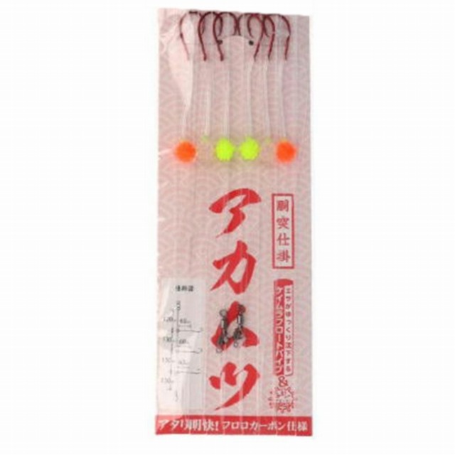 真鯛、イサキ、青物、アマダイ、イシダイなど五目狙い用の吹き流し仕掛が新登場! 根ズレによるラインブレイクを軽減させる「フロロカーボンライン」採用。感度の良さと潮の流れにも負けないコシの強さで鈎の踊りが違います。 紫外線で青白く光る「ケイムラフック」採用。鋭さと強度を両立した高品質鈎に、妖しく発色するケイムラコートを施しました。紫外線を受けながら水に浸かった時の独自の色合いとアピール力で、今までにない驚きの釣果を可能にします。