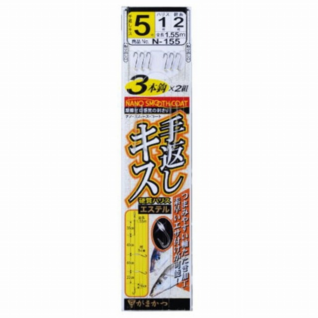 [◆沖縄/離島/北海道のお客様に対する発送が出来ません。]【メーカー希望小売価格\330】N155 手返しキス仕掛 3本鈎 5-1のことなら当店へ 投げ用セット がまかつ製品を多数取り揃え がまかつ 手返しキス投仕掛 3本鈎 ●品名コード:N155 ●号数:5 ●ハリス:1 ●幹糸:2 ●入数:2 ●使用鈎:手返しキス(ナノスムースコート)3本(2組入)