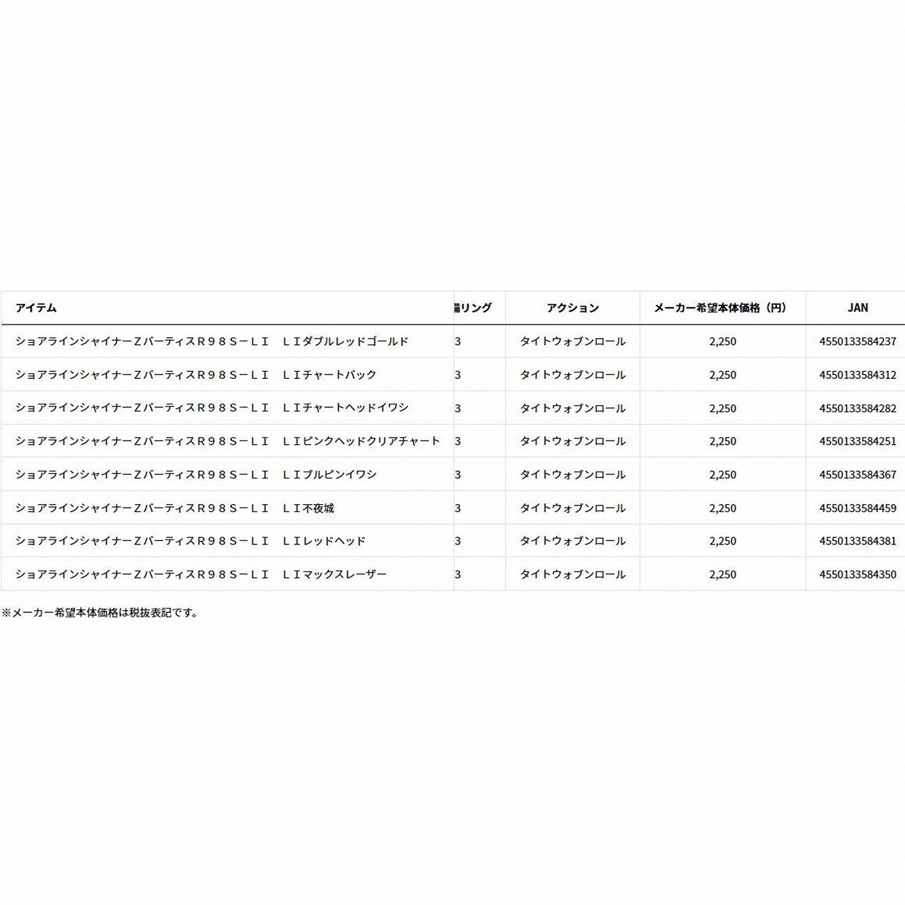 ショアラインシャイナーZバーティスR98S?LI LIピンクヘッドクリアチャート