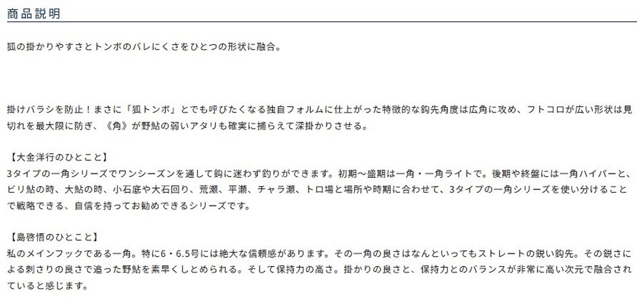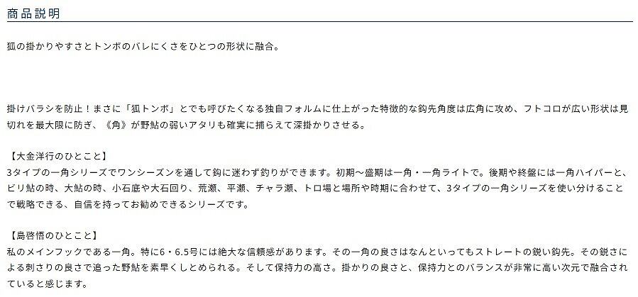 掛けバラシを防止!まさに「狐トンボ」とでも呼びたくなる独自フォルムに仕上がった特徴的な鈎先角度は広角に攻め、フトコロが広い形状は見切れを最