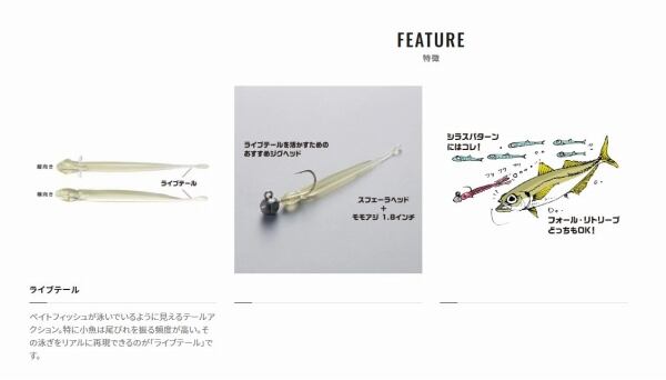 ベイトフィッシュが泳いでいるように見えるテールアクション。特に小魚は尾びれを振る頻度が高い。その泳ぎをリアルに再現できるのが「ライブテール」です。