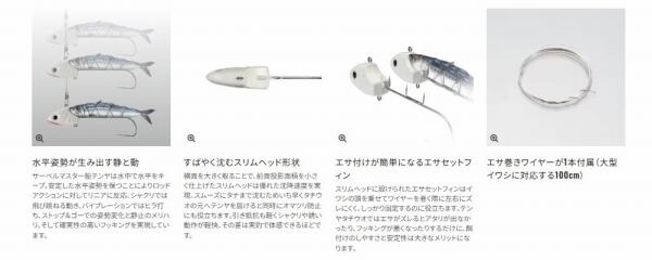 サーベルマスター船テンヤはスリムヘッドにより高速落下で素早く確実にタナに届き、水中では水平姿勢をキープ。ロッドからの入力に対しリニアに反応するため、スローからファスト、ロングからショートと、あらゆる誘いアクションを可能にし、安定したフッキング性能を発揮します。