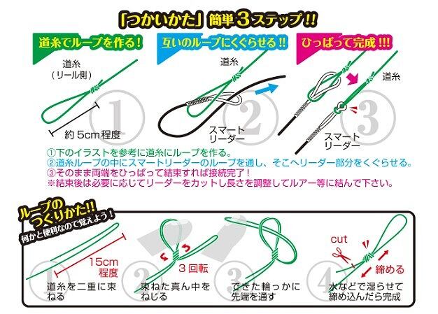 爆釣タイムを逃さない!セット簡単お手軽リーダー。目の前で爆釣しているのにリーダーが切れた!そんな時に活躍するのがPE編み込みループ仕様の「スマートリーダー」です。道糸にループを作り、そこへくぐらせるだけのループtoループの簡単接続でリーダーシステムを組む必要がなく、初心者の方にも最適!もちろんリーダーはフロロカーボンライン使用でエギング、ライトショアジギングなど様々なソルトルアーゲームに活躍、スピーディーなリーダー交換でチャンスタイムを逃しません。