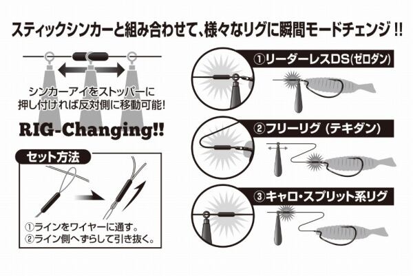 ドロップ系シンカーと組み合わせることで、結び変えることなく様々なリグにモードチェンジできるマルチストッパーです。ご使用のドロップシンカーのアイの中をギリギリ通るサイズをチョイスすることで、シンカーストッパーの機能を生かしつつ、意図したタイミングでシンカーの前後に移動させることが可能。フリー系リグやゼロダン風、またはキャロ系リグに早変わり。特に、ロッドを多く持てないおかっぱりでの強い味方となります。もちろんテキサスリグストッパーとしても使用可能。