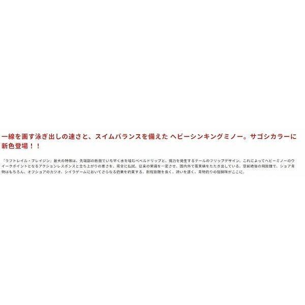 『ラフトレイル・ブレイジン』最大の特徴は、先端部の断面でいち早く水を噛むべベルドリップと、揚力を発生するテールのフリップデザイン。これによってヘビーミノーのウイークポイントとなるアクションレスポンスと立ち上がりの悪さを、完全に払拭。従来の常識を一変させ、国内外で高実績をたたき出している。空前絶後の飛距離で、ショア青物はもちろん、オフショアのカツオ、シイラゲームにおいてさらなる釣果を約束する。射程距離を長く。誘いを速く。青物釣りの醍醐味がここに。