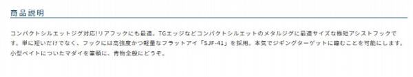 コンパクトシルエットジグ対応!リアフックにも最適。TGエッジなどコンパクトシルエットのメタルジグに最適サイズな極短アシストフックです。単に短いだけでなく、フックには高強度かつ軽量なフラットアイ「SJF-41」