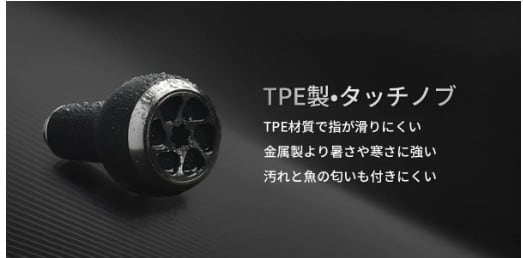 ?TPE製は、Evaより摩擦力が大きくて指が滑りにくい上に、金属製より、暑さや寒さの過酷な環境でも強い材質?環境配慮もされた材質?汚れを取り除きやすいです?魚の生臭い匂いが付きにくいです?「グリッ」と速く回転させてラインの巻取りだけでルアーをアクションさせるリーリングジャークがとてもやりやすいです。?回転の慣性が働きやすくなるので、ラインテンションに対して軽い力でハンドルが回せるため、巻き心地は軽く、疲れにくいです。