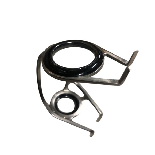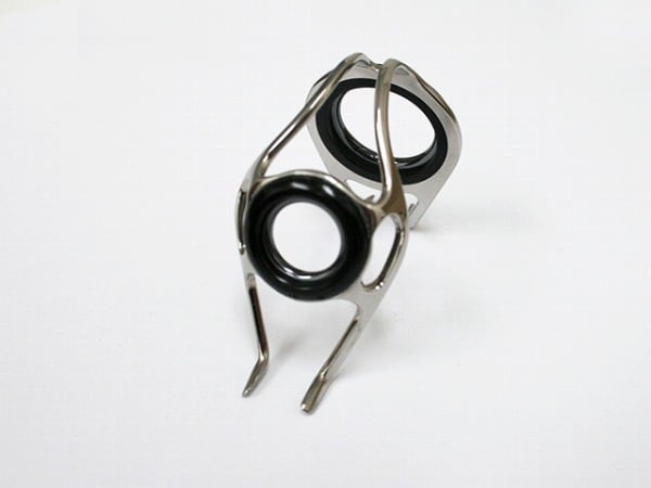 投げ竿のパワーを大きく引き出すために、2連ガイドを下方向(リールシート方向)に装着すると、リールとバットガイドの距離が短くなります。その場合、2連ガイドのエントランス径は大きいほど糸の収束抵抗が少なくなると考えています。