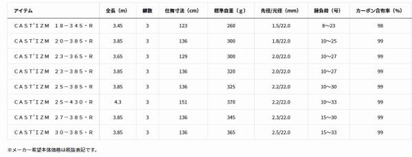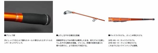 もっと遠くへ。その思いを叶えるべく投竿のノウハウを活かした形にした「CAST’IZM」。釣りのボーダーレス化に対応し、自由な発想で「投げる」釣りを愉しむためのライトコンセプト。並継ならではの調子と遠投性能に加え、さらにしなやかになった穂先は幅広い魚種に対応する。新たな提案となるキャスラバ対応モデル(18-345)や長尺モデル(25-430)もラインナップ。