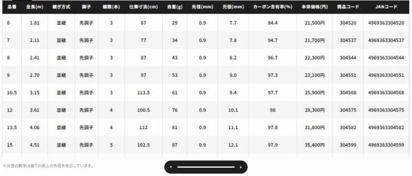 6〜18のワイドラインナップが野釣り、管理釣り場、釣り堀までを幅広く網羅。力強い18は新べらを狙う“沖打ち”で性能を発揮し、最短の6は、盛期の乗っ込み狙いのみならず、ハイスピードが求められる浅ダナの釣りでも活躍が期待されます。10.5、12、13.5、15、16.5に関しては、最適な竿の長さを選ぶことで、底釣りファンが長い仕掛けで対応していた調整をよりやりやすくします。