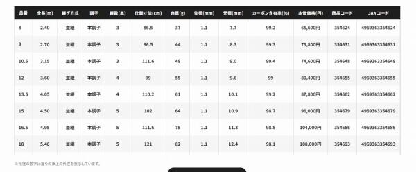 8から30までのワイドラインナップ。管理釣り場でも野釣り場でも、この「軽さ」があなたのへらぶな釣りをサポートする。