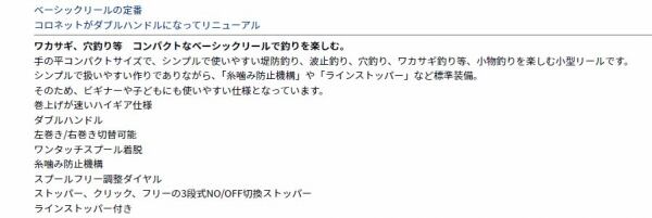 手の平コンパクトサイズで、シンプルで使いやすい堤防釣り、波止釣り、穴釣り、ワカサギ釣り等、小物釣りを楽しむ小型リールです。