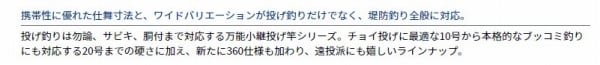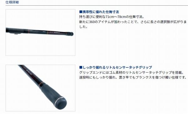 投げ釣りは勿論、サビキ、胴付まで対応する万能小継投げ竿シリーズ。チョイ投げに最適な10号から本格的なブッコミ釣りにも対応する20号までの硬さに加え、新たに360仕様も加わり、遠投派にも嬉しいラインナップ。