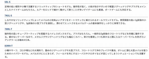 小磯やサーフ、ゴロタ場などの大場所で、重めのジグヘッドリグや大型プラグ、フロートリグで沖のブレイクや激流、ボトムに潜む大型メバルを狙うためのハイパワーモデル。メバルだけにとどまらず、フィールドを共にするシーバスやクロダイなどが混じってしまうシチュエーションでも活躍する。