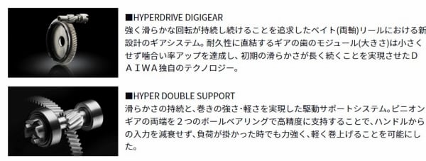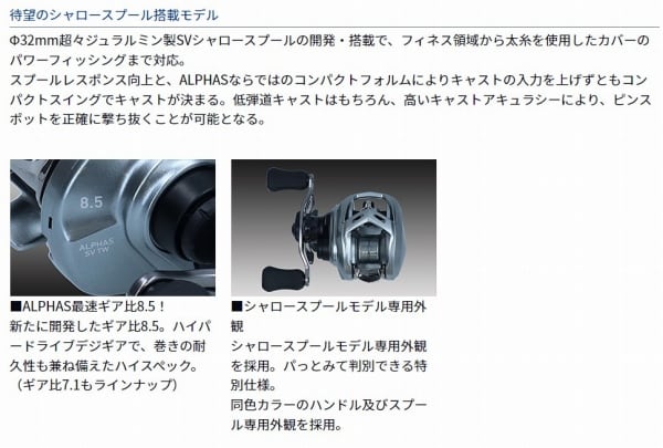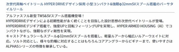 アルファスフル新型 TWS&SVスプール搭載機登場!HYPERDRIVEデザインによる初期性能が永く続くことを目指した設計思想の次世代ベイトリールが登場。HYPERDRIVEデジギア搭載で、強度UPと回転フィーリングUPを実現し、HYPER ARMED HOUSING(Al)でコンパクトながら、強靭なボディ剛性を実現。キャストアキュラシーもスプールφ32mmSVスプールを搭載し、軽量ルアーから幅広いルアーウエイトに対応。ソルト対応とし、様々な釣種に対応することはもちろんコアアングラーからビギナーまで、使いやすさはALPHASシリーズの特徴を継承している。