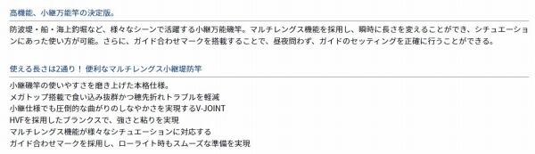 防波堤・船・海上釣堀など、様々なシーンで活躍する小継万能磯竿。マルチレングス機能を採用し、瞬時に長さを変えることができ、シチュエーションにあった使い方が可能。さらに、ガイド合わせマークを搭載することで、昼夜問わず、ガイドのセッティングを正確に行うことができる。
