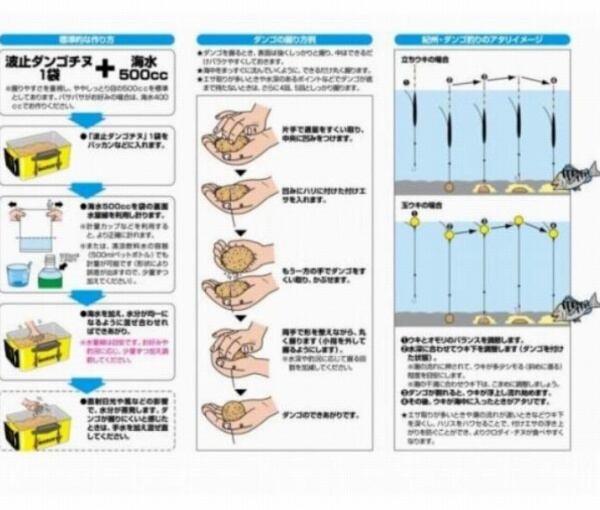 紀州・ダンゴ釣りのダンゴが、海水を加えるだけで作れます。まとまりがいいから握りやすく、適度な重さがあるので素早く沈みます。着底後の崩れもスピーディで、テンポよく釣りが楽しめます。カンタン・手軽に紀州・ダンゴ釣りをしたい人にぴったりです。