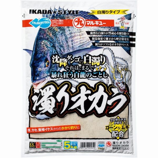 フワッとしたソフトタッチで握りやすい特殊なオカラ素材をマルキユー独自の比率で配合。着水と同時に強烈な白い濁りの帯をつくりながら沈下するため、クロダイ・チヌの警戒心を解き、潮下からも呼び寄せることが可能となるダンゴエサです。単品で10秒間に5.5m沈下する重さを備えているので、従来のあらゆるダンゴ素材とも相性が抜群。「ニュー赤だんごチヌ」や「パワーダンゴチヌ」といった人気のベースエサをはじめ、お好みのダンゴエサとブレンドすると、握りのタッチにふんわりとした感触と白い濁りをプラスすることができます。手につきにくいので手離れがよく、打ち返しもスムーズ。一日中ダンゴを握っても疲れません。