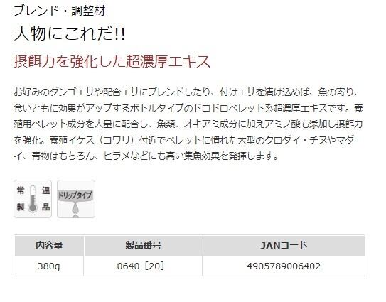 お好みのダンゴエサや配合エサにブレンドしたり、付けエサを漬け込めば、魚の寄り、食いともに効果がアップするボトルタイプのドロドロペレット系超濃厚エキスです。養殖用ペレット成分を大量に配合し、魚類、オキアミ成分に加えアミノ酸も添加し摂餌力を強化。養殖イケス(コワリ)付近でペレットに慣れた大型のクロダイ・チヌやマダイ、青物はもちろん、ヒラメなどにも高い集魚効果を発揮します