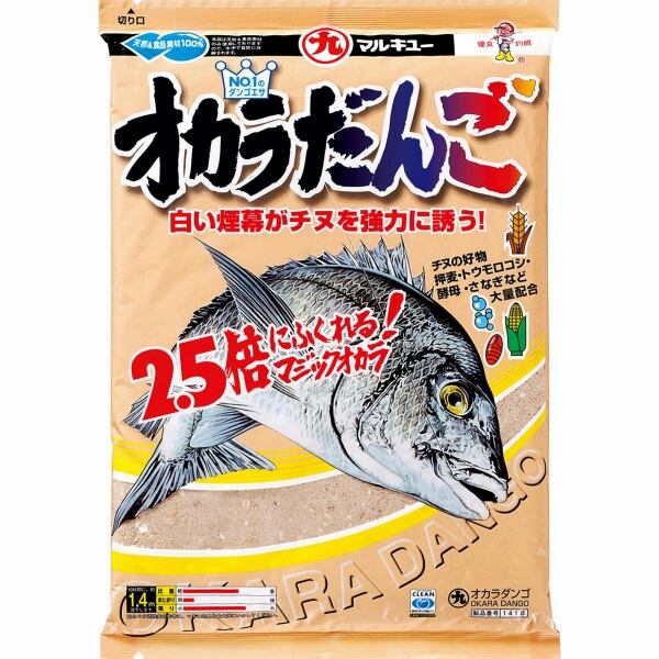 特殊なオカラを主原材料にムギ、コーン、酵母、さなぎなどを配合。水を加えると2.5倍に膨れ、強力な濁りでチヌの警戒心を解きます。お好みの配合エサとブレンドすれば、ヒシャク離れがよくなり飛距離がのびます。