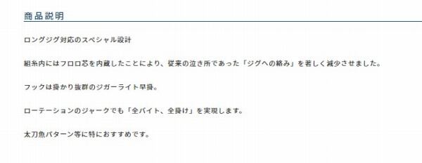 ロングジグ対応のスペシャル設計。組糸内にはフロロ芯を内蔵したことにより、従来の泣き所であった「ジグへの絡み」を著しく減少させました。フックは掛かり抜群のジガーライト早掛。ローテーションのジャークでも「全バイト、全掛け」を実現します。