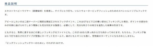 アピールしたいのは二段テーパーに精密尖頭加工されたフックポイント。これはGTなどで口の硬い部分にフッキングした場合、ポイントの部分のみが内側に曲げられてしまう現象にも充分対抗する強度と、必要にして、充分な刺さりの両立を追及した結果の形状です。ともすると、魚骨に達するほどの激しいフッキングのファイトにも、このST-66なら真っ向から立ち向かってゆけます。もちろん、フッキング後はヒラ打ち加工されたゲイブが堅強にターゲットをホールド。曲げにもヒネリにも強く、怪物級のターゲットにもものおじしません。「ビッグフィッシュアングラーのために」それがST-66です。
