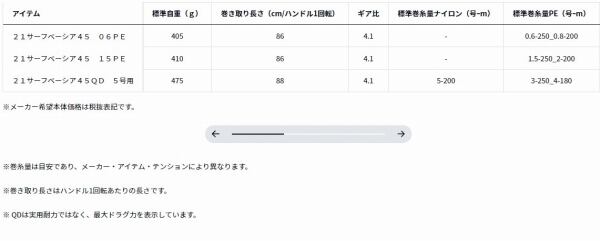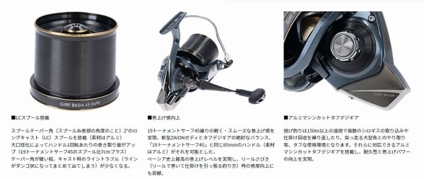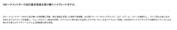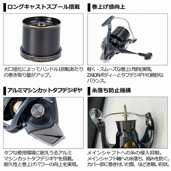 19トーナメントサーフ45から受け継いだ飛距離と回転・耐久性能を実現した投釣り専用機。大口径2°テーパーのロングキャスト(LC)スプール、ラインを綾巻きし、ライン同士の食い込みを抑えるクロスラップを搭載し、スムーズなライン放出を実現。パワフルさと巻き易さを追求したギア比「4.1」を全アイテムにて採用。ZAIONボディとタフデジギアの絶妙なバランスによる滑らかな巻上げとマグシールドによる回転耐久性を実現。