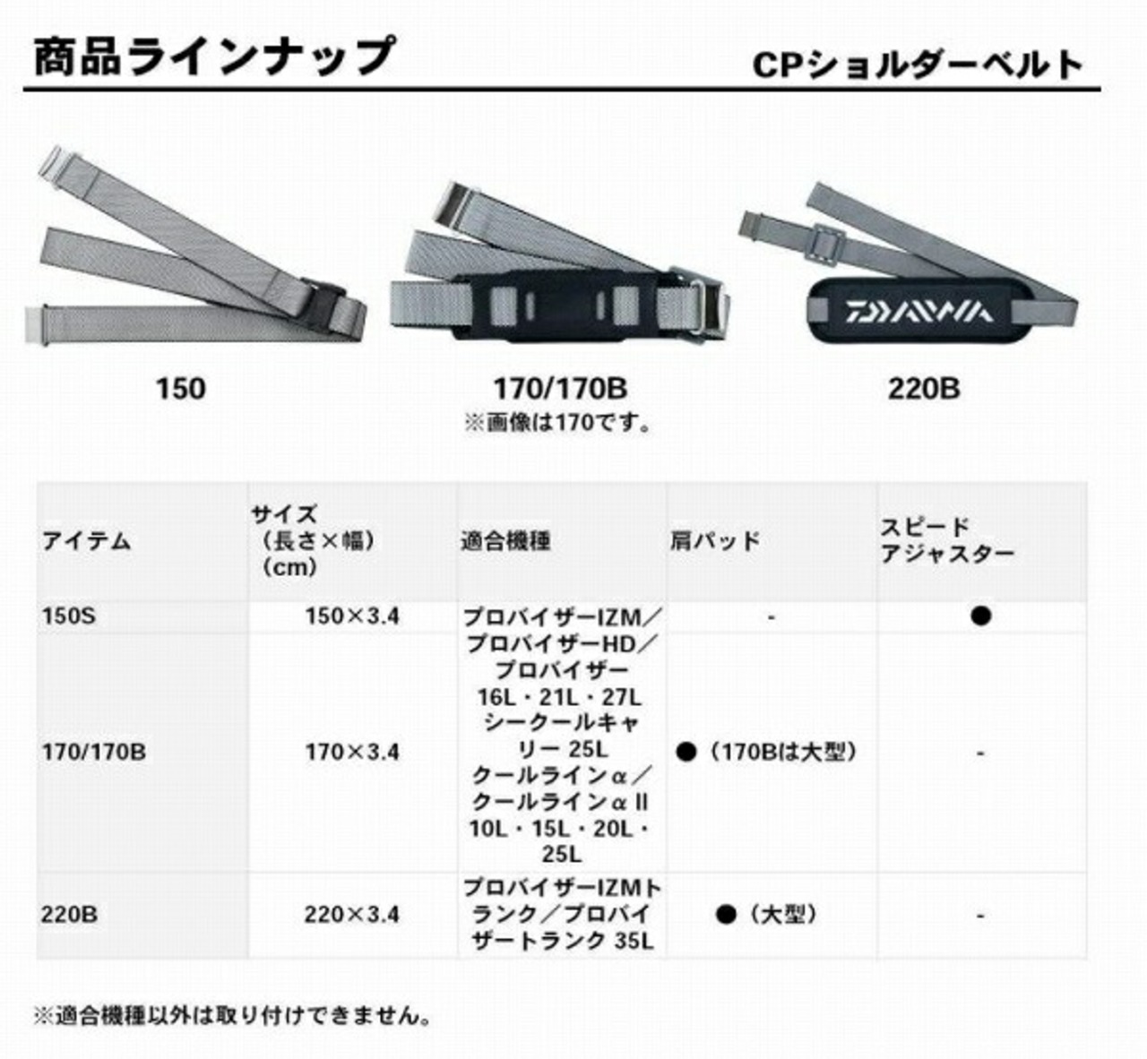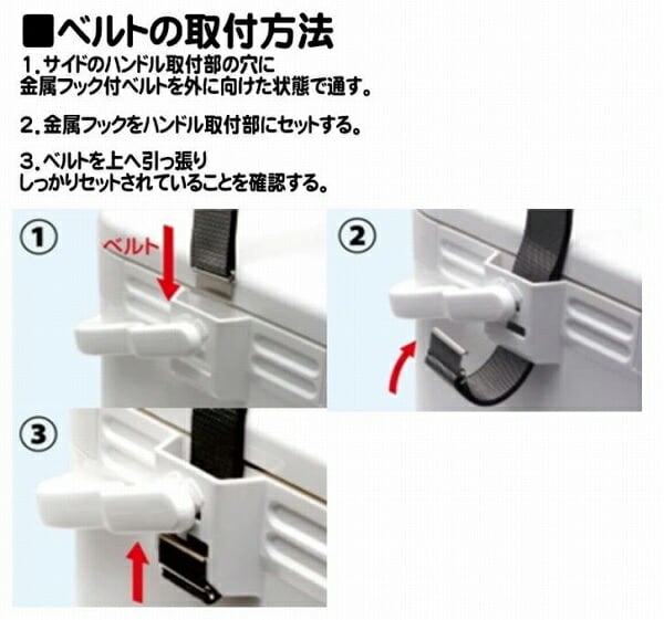 ワンタッチ金属フック式で取付け取外しが簡単スピーディー ベルトはクーラーの底面に通らないので汚れにくい ラクラク大型パッド付き(170B、220Bのみ) ベルトの余分な部分が邪魔にならないベルト留め具