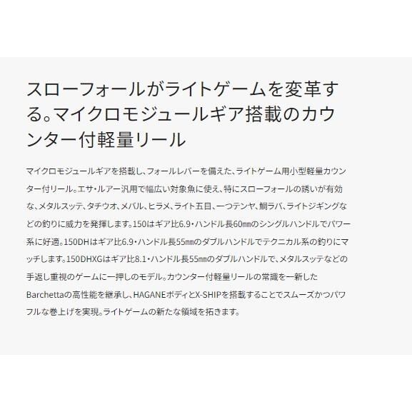 マイクロモジュールギアを搭載し、フォールレバーを備えた、ライトゲーム用小型軽量カウンター付リール。エサ・ルアー汎用で幅広い対象魚に使え、特にスローフォールの誘いが有効な、メタルスッテ、タチウオ、メバル、ヒラメ、ライト五目、一つテンヤ、鯛ラバ、ライトジギングなどの釣りに威力を発揮します。