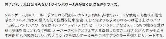 ソルトゲーム用のリールに求められる「強さのカタチ」は実に多様だ。ハードな使用にも耐える剛性感とタフネス、海水の侵入を防ぐ強固な防水性能、そして何よりも求められるのは巻き上げのパワー。新しいツインパワーSWはインフィニティドライブ、ヒートシンクドラグなどステラSWの強さを受け継ぐ機構を惜しげもなく搭載。