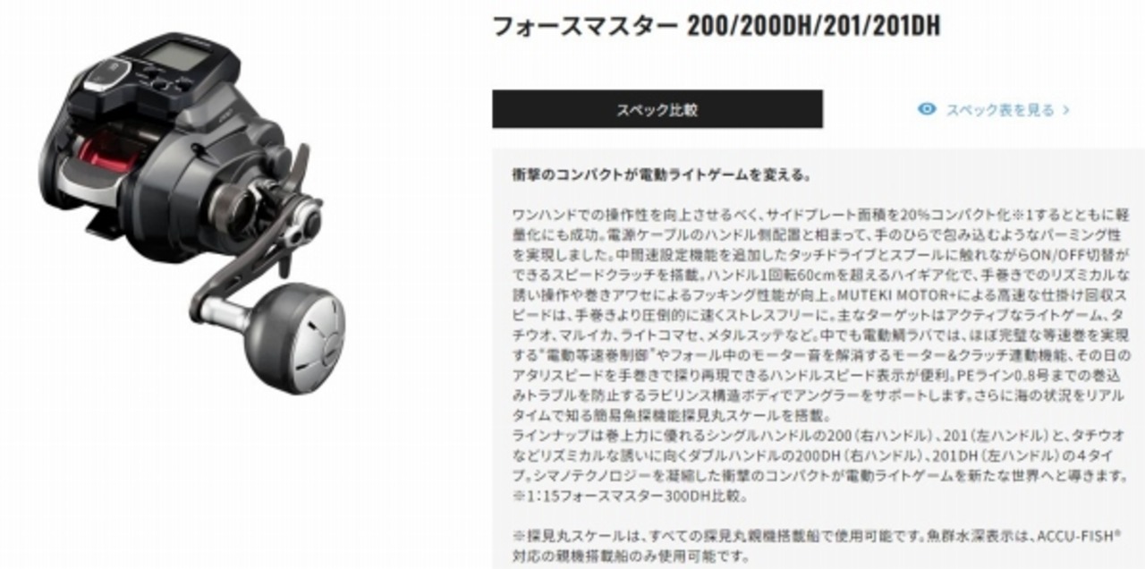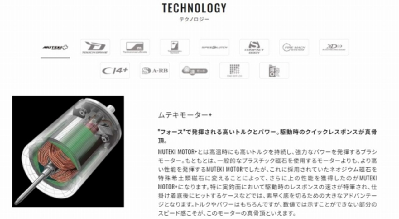 ワンハンドでの操作性を向上させるべく、サイドプレート面積を20%コンパクト化※1するとともに軽量化にも成功。電源ケーブルのハンドル側配置と相まって、手のひらで包み込むようなパーミング性を実現しました。中間速設定機能を追加した“NEWタッチドライブ”とスプールに触れながらON/OFF切替ができる“スピードクラッチ”を搭載。ハンドル1回転60cmを超えるハイギア化で、手巻きでのリズミカルな誘い操作や巻きアワセによるフッキング性能が向上。
