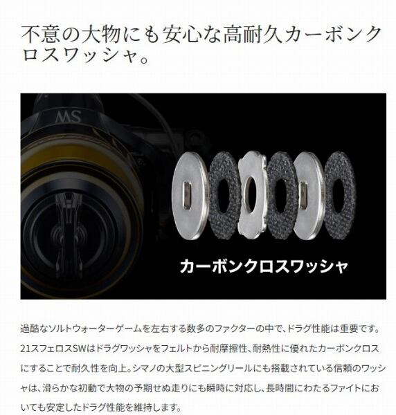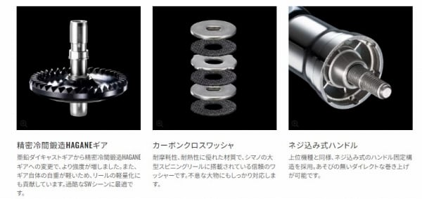 2021年モデルはさらにインフィニティドライブ、HAGANEギア、カーボンクロスワッシャを追加で装備し、耐久性とともにパフォーマンスがいっそう向上。またHAGANEギア、マシンカットアルミハンドルの採用で、自重は前モデルより50〜85g軽量化。近海における重要度が高い5000HG、6000HG、6000PG、8000HG、8000PGの5アイテムを網羅し、ジギングからキャスティングまで、ショア・オフショア問わず幅広いゲームに適応する。