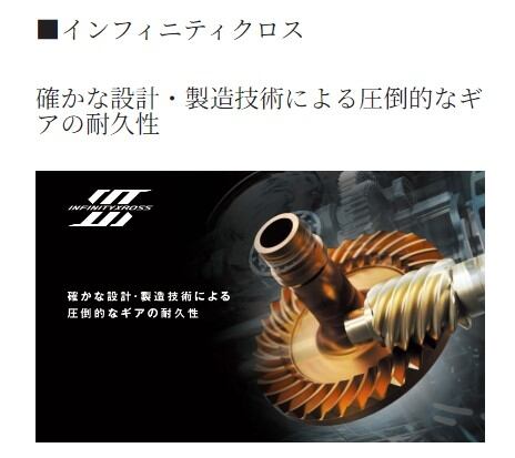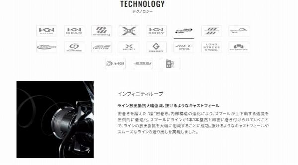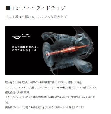 ギア歯面の設計・製造技術の進歩により実現した、高耐久ギア設計インフィニティクロス。ラインをより密に、整然とスプールへと巻き上げ、放出時の抵抗を軽減するインフィニティループ。高負荷時でもグイグイと軽快に巻き取れる特殊構造インフィニティドライブ。