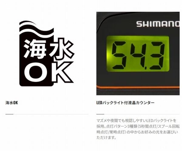 前作からハンドルをロング化し、巻き上げ性能を向上。夜釣りはもちろん、日中でも高視認性を誇り、電池交換やLEDバックライトを装備。鯛ラバ、ライトジギング、メタルスッテといったオフショアルアーから船のライトゲームまで、手軽で、信頼感のあるゲームをお届けします。