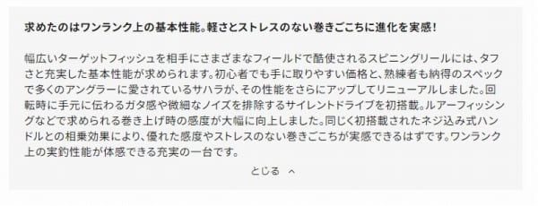 幅広いターゲットフィッシュを相手にさまざまなフィールドで酷使されるスピニングリールには、タフさと充実した基本性能が求められます。初心者でも手に取りやすい価格と、熟練者も納得のスペックで多くのアングラーに愛されているサハラが、その性能をさらにアップしてリニューアルしました。回転時に手元に伝わるガタ感や微細なノイズを排除するサイレントドライブを初搭載。ルアーフィッシングなどで求められる巻き上げ時の感度が大幅に向上しました。同じく初搭載されたネジ込み式ハンドルとの相乗効果により、優れた感度やストレスのない巻きごこちが実感できるはずです。ワンランク上の実釣性能が体感できる充実の一台です。