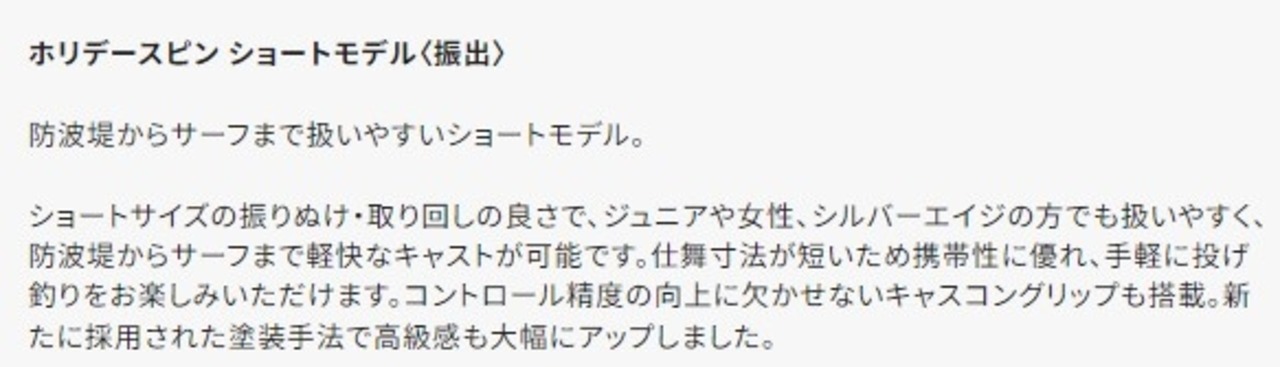 ショートサイズの振りぬけ・取り回しの良さで、ジュニアや女性、シルバーエイジの方でも扱いやすく、防波堤からサーフまで軽快なキャストが可能です。仕舞寸法が短いため携帯性に優れ、手軽に投げ釣りをお楽しみいただけます。コントロール精度の向上に欠かせないキャスコングリップも搭載。新たに採用された塗装手法で高級感も大幅にアップ