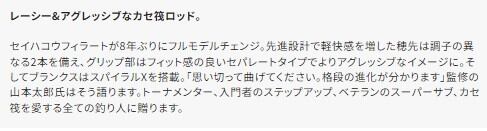 先進設計で軽快感を増した穂先は調子の異なる2本を備え、グリップ部はフィット感の良いセパレートタイプでよりアグレッシブなイメージに。そしてブランクスはスパイラルXを搭載