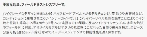 ハイグレードなデザインをまといIG ハイスピード アペルトがモデルチェンジ。夜 釣りや悪天候など、コンディションに左右されにくいインナーガイドで、#1にハ イパーリペル処理を施すことによりライン放出性能も秀逸。