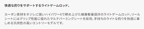 カーボン素材をネジレに強いハイパワーXで締め上げた細身軽量設計のライトゲームロッド。リールシートにはグリップ性能に優れたマルチパーミングシートを採用、手持ちのライトな釣りを快適に楽しめる汎用性の高いエントリーモデルです。