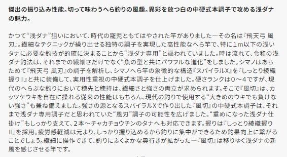 硬さランクは0〜4ですが、現代のへらぶな釣りにおいて穂先と穂持は、繊細さと強さの両立が求められます。そこで『風切』は、カッツケウキを自在に操れる従来の性能はもちろん、現代の釣りで使用する“大きめのウキでも負けない強さ”も兼ね備えました。強さの源となるスパイラルXで作り出した『風切』の中硬式本調子は、それまで浅ダナ専用調子だと思われていた“風刃”調子の可能性を広げました。