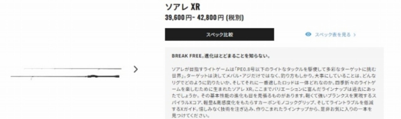 ソアレが目指すライトゲームは「PE0.8号以下のライトなタックルを駆使して多彩なターゲットに挑む世界」。ターゲットは決してメバル・アジだけではなく、釣り方もしかり。大事にしていることは、どんなリグでどのように釣りたいか、そしてそれに一番適したロッドは一体どれなのか。四季折々のライトゲームを楽しむために生まれたソアレ XR。ここまでバリエーションに富んだラインナップは過去にもありません。 その基本性能の進化も目を見張るものがあります。軽くて強いブランクスを実現するスパイラルXコア、軽量&高感度化をもたらすカーボンモノコックグリップ、そしてライントラブルを低減するXガイド。惜しみなく技術を注ぎ込み、作りこまれたラインナップから、是非お気に入りの一本を見つけてください。