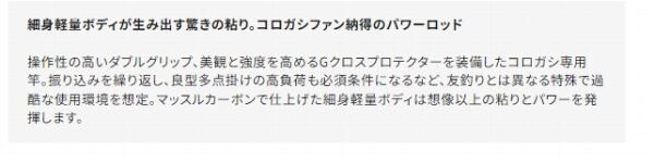 「振り込みを繰り返し、多点掛けの良型の引きを確実に受け止めるなど、友釣りとは異なる特殊で過酷な使用環境を想定したコロガシ専用竿。操作性を追求したロッドワークは軽快そのもの。マッスルカーボン&マッスルループ構造で仕上げた細身軽量ボディは想像以上の粘りとパワーを発揮。ハードな使用に耐える堅牢ボディ、操作性を高めるダブルグリップ、元竿玉口には美観と強度を高めるGクロスプロテクターを装備。コロガシファンの期待に応えます。