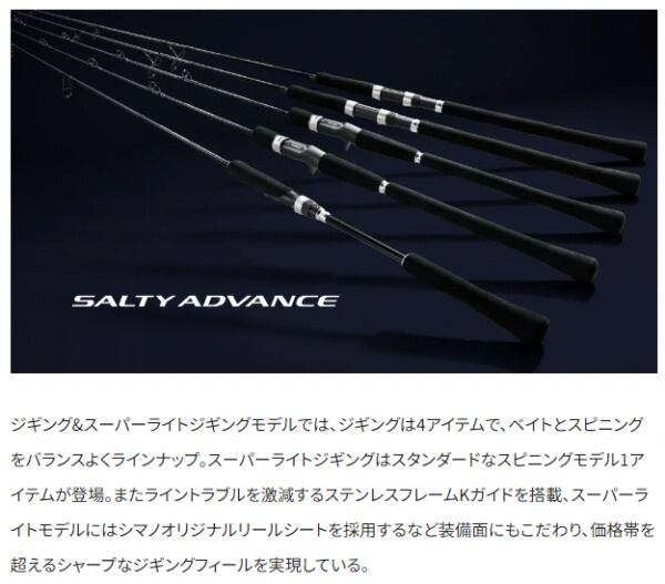ソルトルアーゲームに挑戦したい、多彩なターゲットを楽しみたいというアングラーのニーズに応えて幅広い釣種に対応するソルティーアドバンスは上位機種譲りのハイレベルなブランクスを採用し、クラスを超える軽さ、シャープさ、パワーを追求。ターゲットごとに専用設計を施した本格仕様とコストパフォーマンスの高さが特長。今季はジギング、スーパーライトジギングといったオフショアの人気カテゴリに5アイテムを投入。ジギングモデルは大型魚を獲るためのパワーと強度を備え、10kgに迫る青物や回遊魚の攻略に活躍、またスーパーライトジギングモデルは100g以下のメタルジグを使ったジギングにマッチ。ビギナーはもちろん、ショアからオフショアへチャレンジするアングラーにも納得の性能となっている。