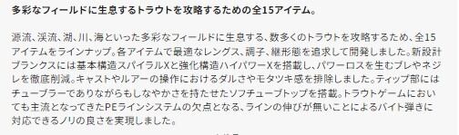 源流、渓流、湖、川、海といった多彩なフィールドに生息する、数多くのトラウトを攻略するため、全15アイテムをラインナップ。各アイテムで最適なレングス、調子、継形態を追求して開発しました。