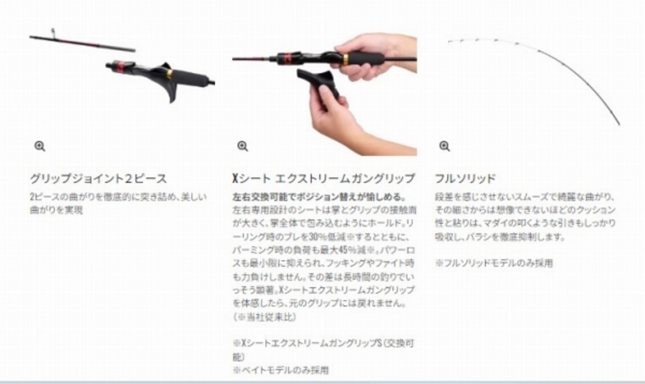 スパイラルX、ハイパワーX採用の新設計ブランクスは軽く強く、ブレを抑えて等速巻きの精度がいっそう向上。ベイトモデルには上質なフィット感と安定した握り心地をもたらすXシート エクストリームガングリップ、スピニングモデルには段差のないパーフェクションシートCI4+を搭載し、実釣性能をさらに磨き上げた新生「炎月SS」。