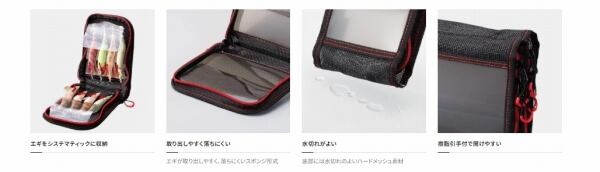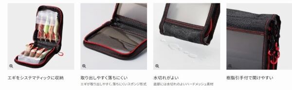 エギが取り出しやすく、落ちにくいスポンジ形式 ・底部には水切れのよいハードメッシュ素材 ・樹脂引手付で開けやすい