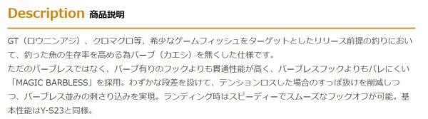 ハイドラグでのファイトにも対応する太軸ワイヤー採用のビッグトレブル。パワー伝導のよい絶妙なカーブポイントとロングテーパーにより驚くほどスムーズな刺さり込みを実現。