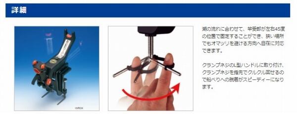 潮の流れに合わせて、竿受部が左右45度の位置で固定することができます。これなら、狭い場所でもオマツリを避ける方向へ自在に対応できます。