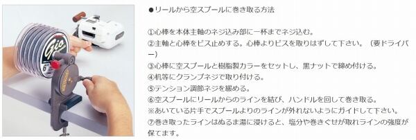 リールのラインを空スプールにスピーディに巻き取り保管できます。巻き取ったラインもリールにラクラク巻き取りできます。3.5倍速ハンドルでラクラクスピーディな高速タイプ。しかも、強力テンションでリールに巻き戻せるので、ジギング用PEラインを巻くのにも最適です。